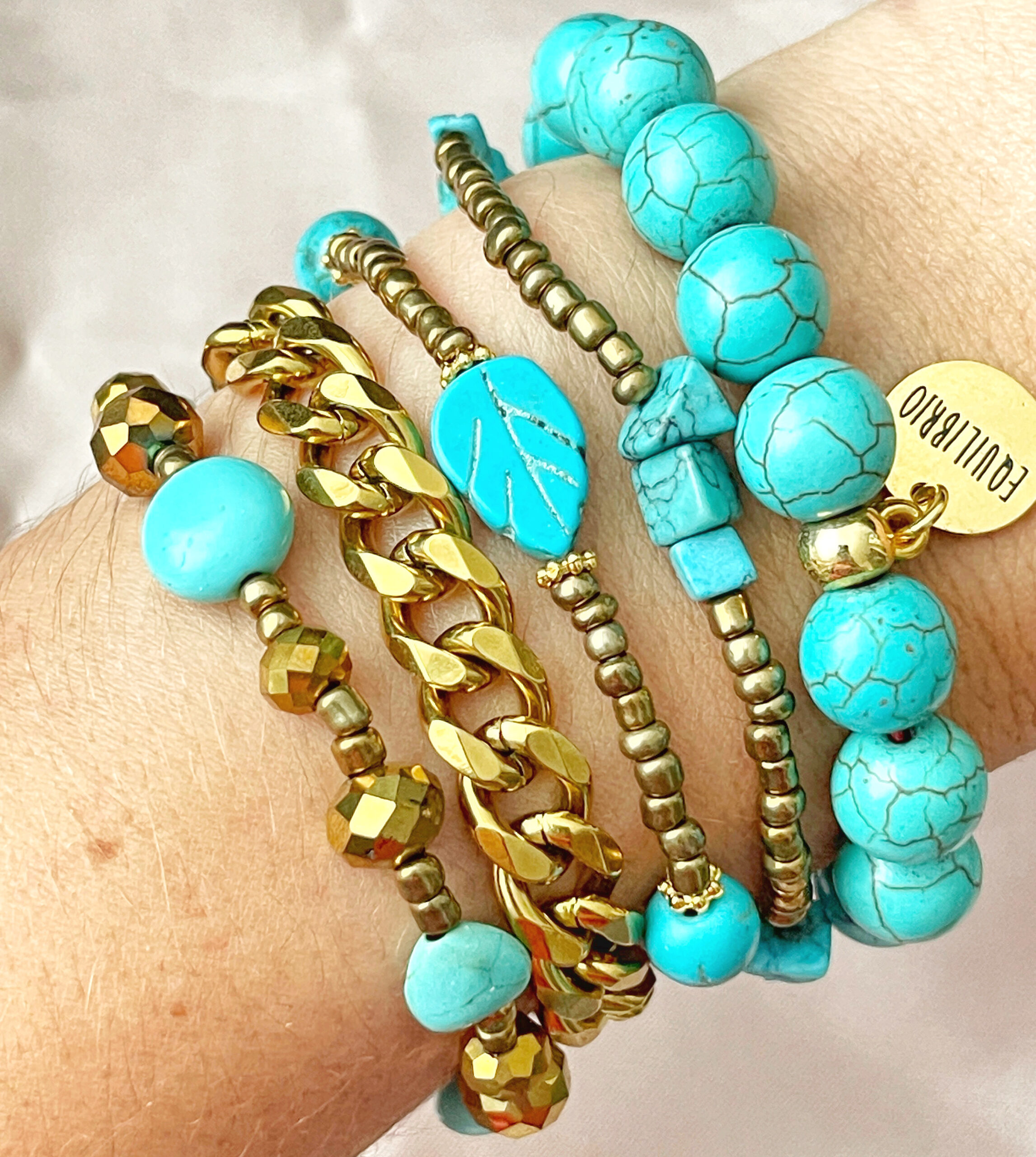 - Material: Piedra natural turquesa, dijes en baño de oro